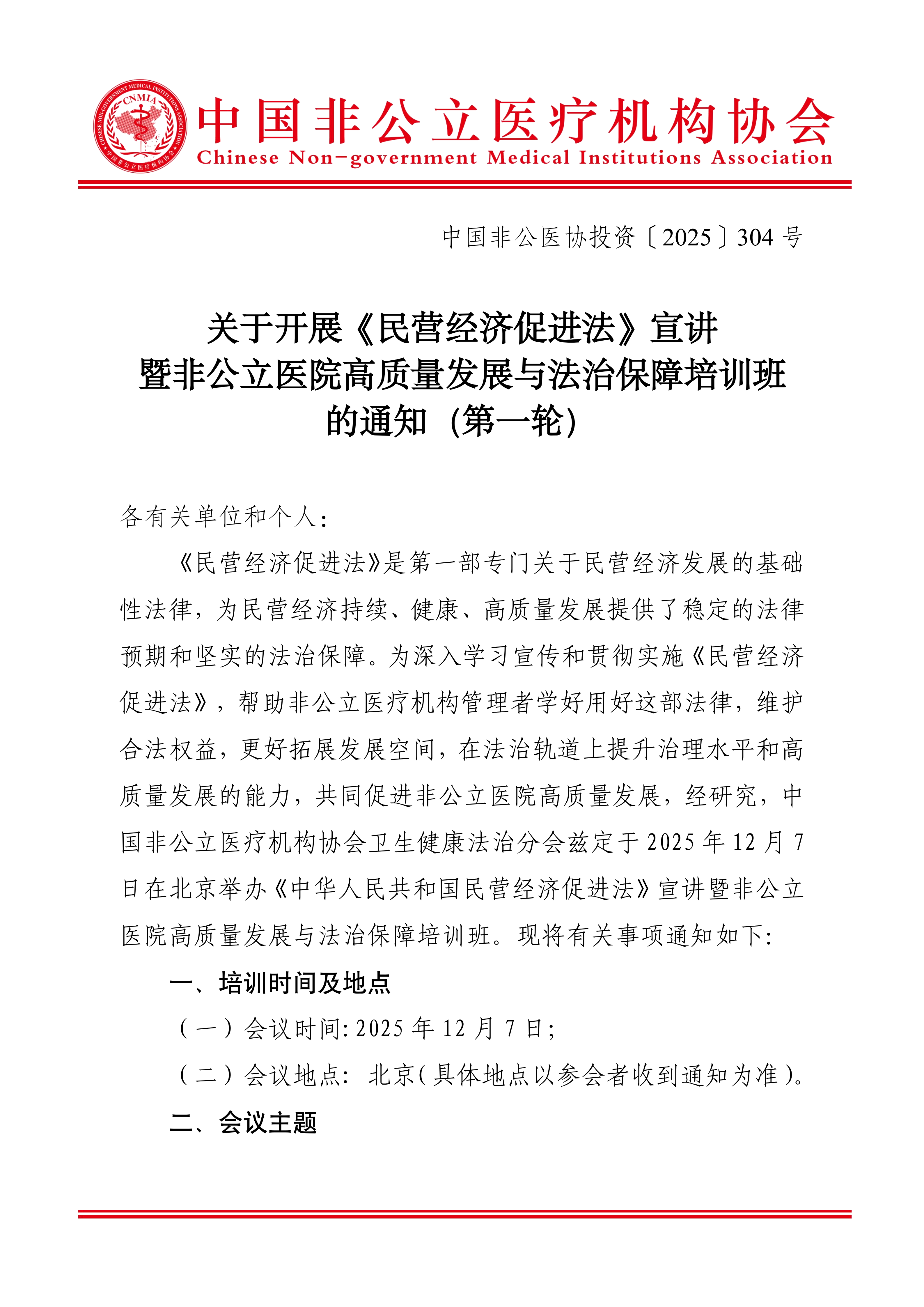專業(yè)培訓(xùn)丨關(guān)于開展《民營經(jīng)濟促進法》宣講暨非公立醫(yī)院高質(zhì)量發(fā)展與法治保障培訓(xùn)班的通知(第一輪)